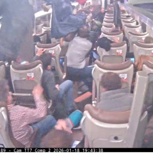 A las 19,43:36 horas, se pierden imágenes de distintas cámaras de los coches 6, 7 y 8 y "de nuevo se aprecian posibles esquirlas incandescentes a través de la ventana situada a la altura del asiento 2A". Al mismo tiempo, "en las cámaras ubicadas en los coches 1 y 3 se aprecia inercia de freno, lo que provoca que el personal que se encuentra de pie se agarre para evitar caerse".
