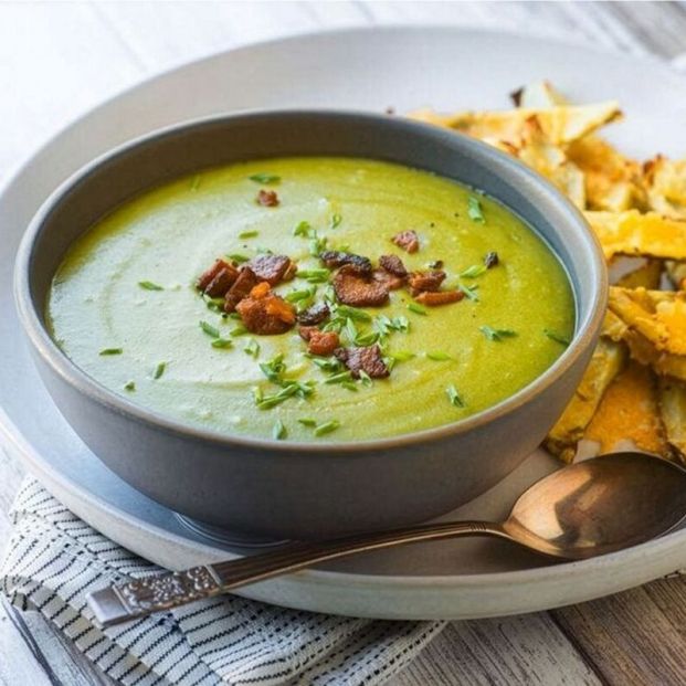 Esta versión cremosa mezcla brócoli, cebolla, caldo de pollo y la pulpa de las patatas usadas para las cortezas. El brócoli aporta alfa-caroteno, zinc, hierro y fitoquímicos que contribuyen al sistema inmunitario.