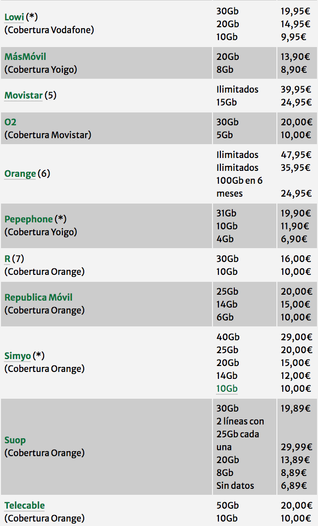 Con datos a partir de 20 Gb mensuales, los precios más bajos los ofrece Xenet: 11 euros por 24 Gb y 12 euros por 30 Gb. A continuación, los 13,89 euros de Suop, los 13,90 euros de MásMóvil y los 14,00 euros de Virgin, en los tres casos ofreciendo 20 Gb. También destacan los 16 euros por 30 Gb de R.