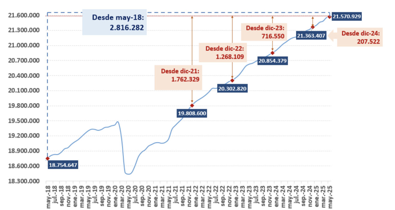 El Ministerio ha subrayado que, sumando los incrementos de cotizantes de abril y mayo (+426.729 ocupados), el crecimiento actual es mayor al del mismo periodo de 2024 (+419.828 ocupados) y al promedio 2017-2019 (+415.842 cotizantes).
