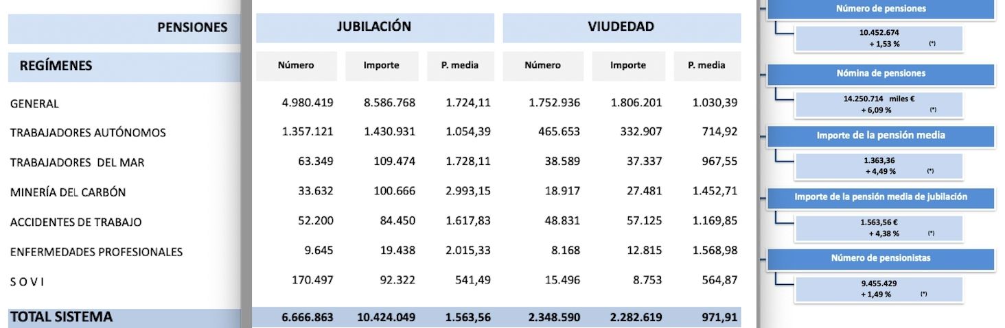Aunque la pensión media en España alcanza los 1.363,36 euros mensuales, según los datos de enero de 2026, que ya incorpora la revalorización del 2,7%, con carácter general, existen grandes diferencias de cuantía según las clases (jubilación, viudedad, etc.) y dependiendo de los regímenes de la Seguridad Social (general, autónomos...). La nómina media de un jubilado, por ejemplo, se sitúa en 1.563,5 euros, pero los que cotizaron al régimen de autónomos perciben solo 1.054,4 euros en promedio.