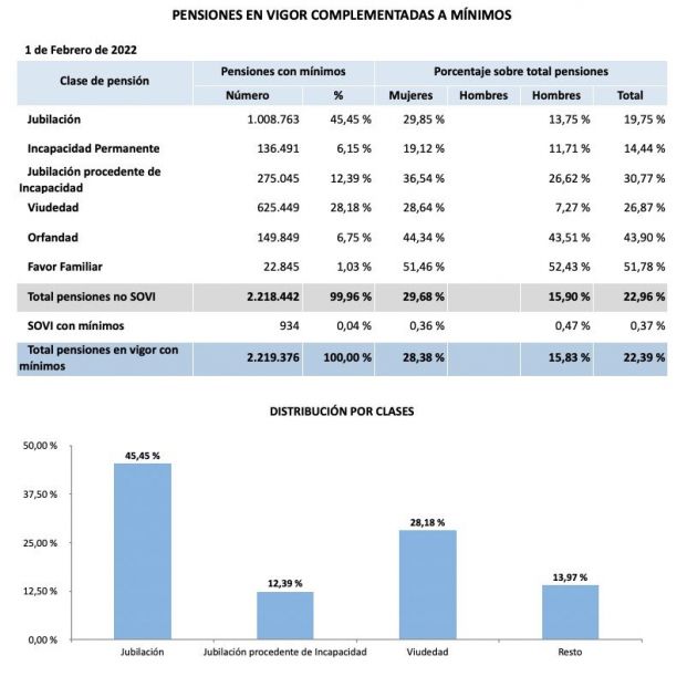Las estadísticas del gasto en pensiones correspondientes al mes de febrero confirman que casi una de cada cuatro pensiones contributivas (22,39% del total) necesita el complemento a mínimos. En concreto, de los 9,91 millones de pensiones generadas por las aportaciones sociales de los trabajadores que se abonaron el mes pasado, 2,22 millones tienen el complemento a mínimos automático que otorga el sistema público.