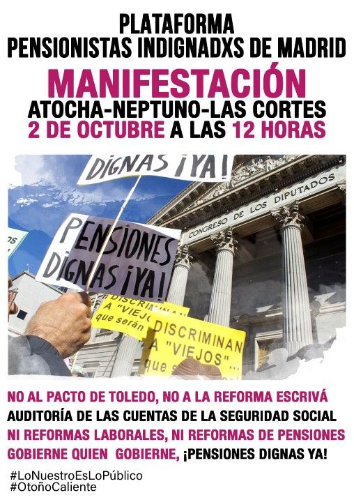 Este sábado 2 de octubre, pensionistas de toda España están llamados a participar en una manifestación-concentración en Madrid para mostrar su "absoluto rechazo al intento de privatizar nuestro sistema de pensiones, en contra del Pacto de Toledo y de la reforma del ministro Escrivá, y para exigir una auditoría de las cuentas de la Seguridad Social para averiguar, entre otros asuntos, a dónde han ido a parar los más de 100.000 millones de euros que entre 1989 y 2013 pertenecían a la hucha de las pensiones y que se destinaron a otras cuestiones”, según denuncian los convocantes de la marcha, el movimiento Otoño Caliente (@CalienteOtono), constituido por más de 70 organizaciones, coordinadoras de pensionistas y sindicatos.