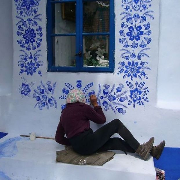 Esta aldea luce ahora con un precioso color azul resultado de los trabajos de Agnes Kašpárková que ha tomado el testigo de otra vecina que años atrás también pintaba las casas del pueblo, aunque ha sido ahora cuando estos preciosos y complejos diseños se han hecho viral.