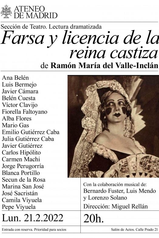 Actores y actrices de renombre como Ana Belén, Javier Cámara, Carmen Machi, Pepe Viyuela o José Sacristán, entre otros, participarán este lunes 21 de febrero en el Ateneo de Madrid en una lectura dramatizada de Farsa y licencia de la reina castiza, obra de Ramón María del Valle-Inclán.