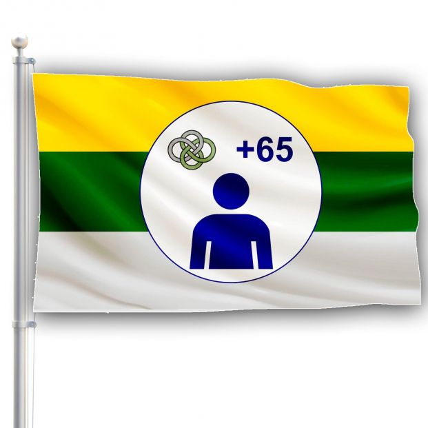 Es la Bandera de la Dignidad y la Experiencia de las Personas Mayores. El diseño de esta bandera —con franjas horizontales oro, verde y plata, y un pictograma central azul con el símbolo de vida al lado— ofrece una representación simbólica y unificadora, ideal para ser utilizada tanto por la comunidad de personas mayores como por las instituciones y asociaciones que las apoyan de manera libre y gratuita.