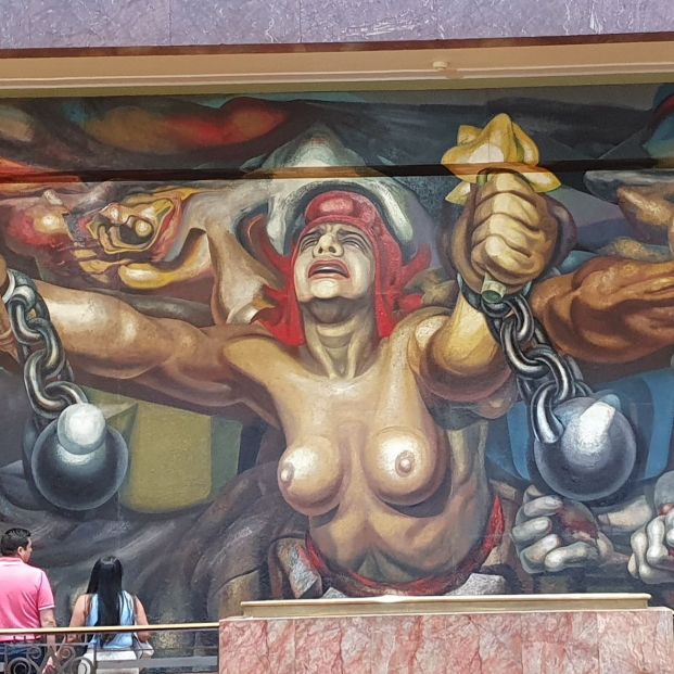 Este mural del mexicano David Siqueiros muestra la imagen central de una figura humana buscando la liberación. Como él mismo relata, para pintar el torso se inspiró en su esposa. Tanto el rostro como los brazos son de él mismo, quien participó en la revolución mexicana cuando tenía 18 años. Las cadenas son de gran tamaño y los grilletes también. Sin embargo, su cabeza está coronada por un gorro frigio, símbolo de libertad, tiene una antorcha en su mano derecha y su expresión es de potente y decidida lucha.