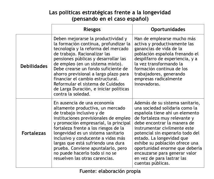 Esta última frase evoca, justamente, la posibilidad de desarrollar políticas que corrijan las debilidades o exploten las fortalezas para limitar los riesgos y cosechar las oportunidades. Ahora sí, pensando en el caso español, se comentan grandes líneas/recomendaciones de políticas estratégicas que podrían aplicarse en nuestro país para afrontar la longevidad desde el balance de debilidades y fortalezas que, en mi opinión, nos caracterizan en este plano.