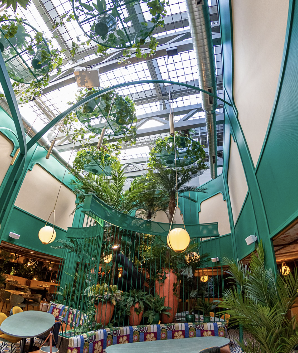 Asombra su abrumadora decoración de la que se ha encargado el arquitecto Adolfo Monserrat. Mientras una jirafa da la bienvenida a los clientes, las plantas exóticas surgen por cada rincón del local y entre ellas encontramos pequeños animales de cerámica en cada esquina.