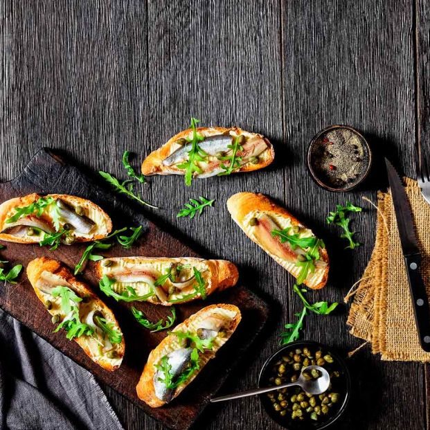 Extiende por encima un par de lomos de boquerón, coloca alguna alcaparra y unas hojitas de rúcula. Termina salpimentando al gusto. ¡Listas para disfrutar!
