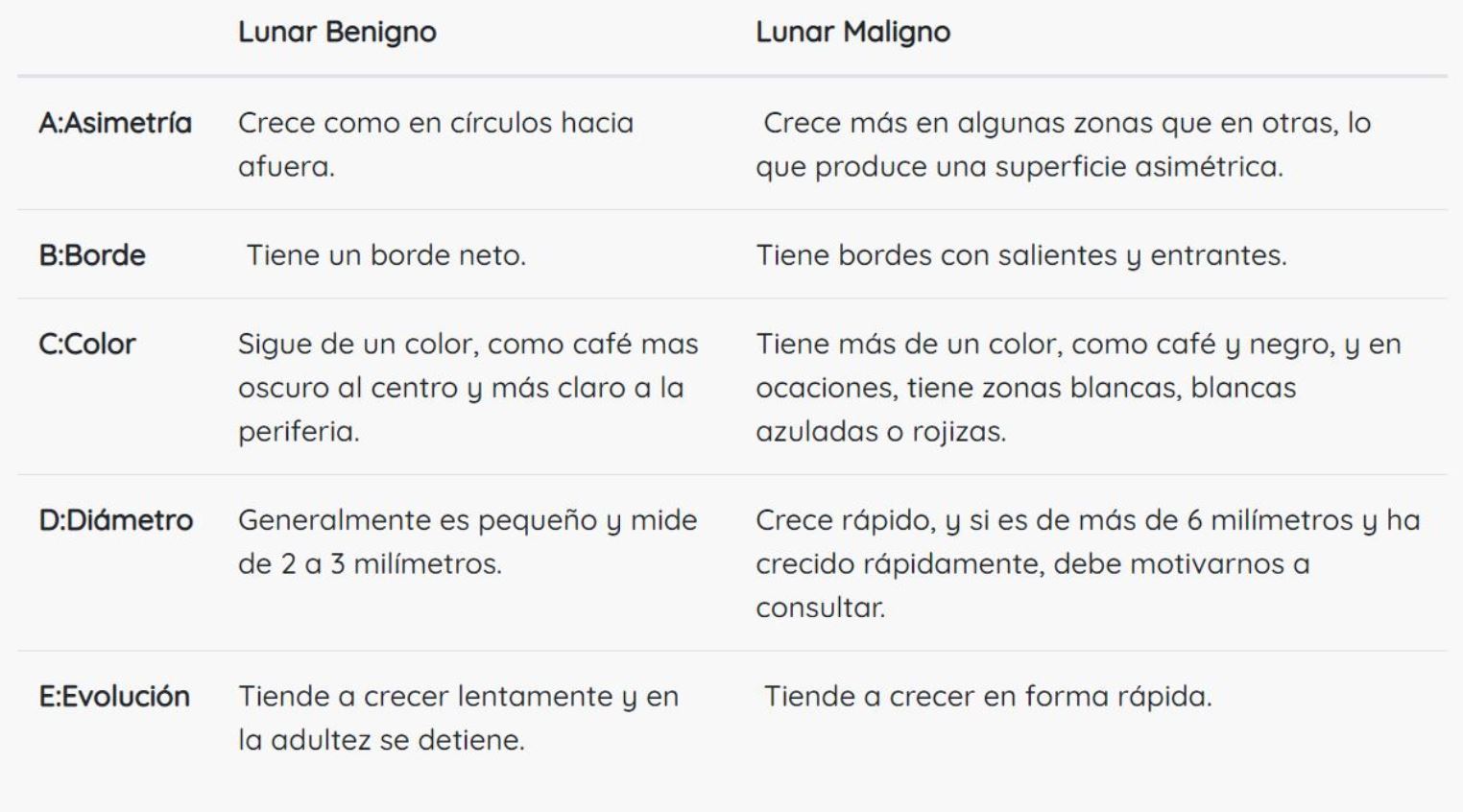 Para tener bajo control el estado de nuestros lunares, lo primero que debemos hacer es mirarlos. Un gesto simple pero que a veces no se hace con el detenimiento que merecen. Una vez que hemos identificado todos los lunares que tenemos, podremos seguir la tabla A,B,C,D,E. Siguiendo estas pautas nos fijaremos en cuestiones como la asimetría (si una mitad del lunar se ve diferente a la otra), sus bordes, los cambios de color, el diámetro (mayor de 5 milímetros) o que se modifique el tamaño, se pique o inflame.