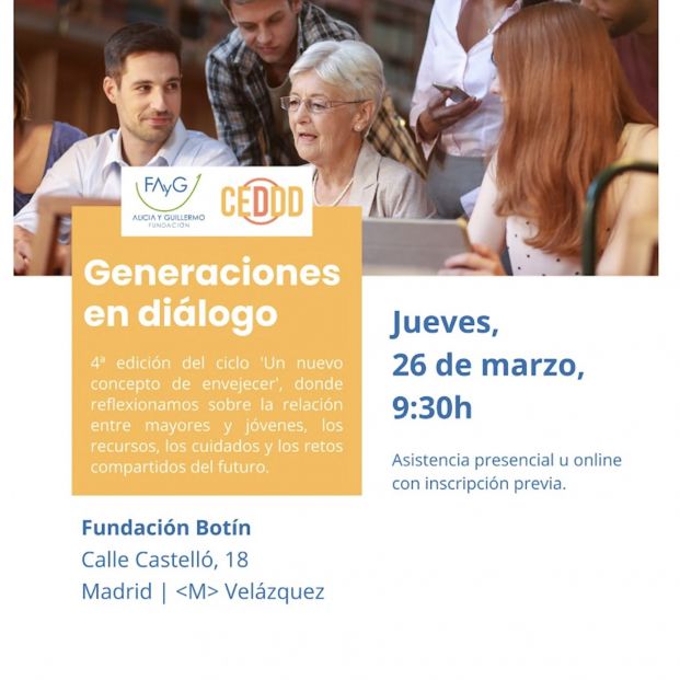 El Consejo Español para la Defensa de la Discapacidad y la Dependencia (CEDDD) y la Fundación Alicia y Guillerm celebran la 4ª edición de la jornada "Generaciones en diálogo", que tendrá lugar el próximo 26 de marzo de 2026 en la Fundación Botín, C/ Castelló 18, 28001 Madrid. Una de las mesas de debate estará moderada por la directora de 65YMÁS, Ana Bedia.