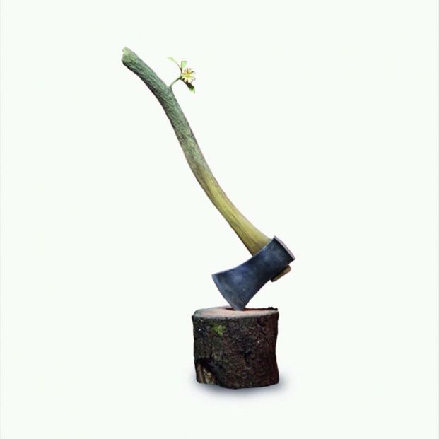 Entre las obras expuestas destaca además una escultura conjunta de Escif y Banksy: un hacha de fibra de vidrio de cuyo mango brota una flor, gesto poético que sintetiza la idea de resistencia a través de la belleza.