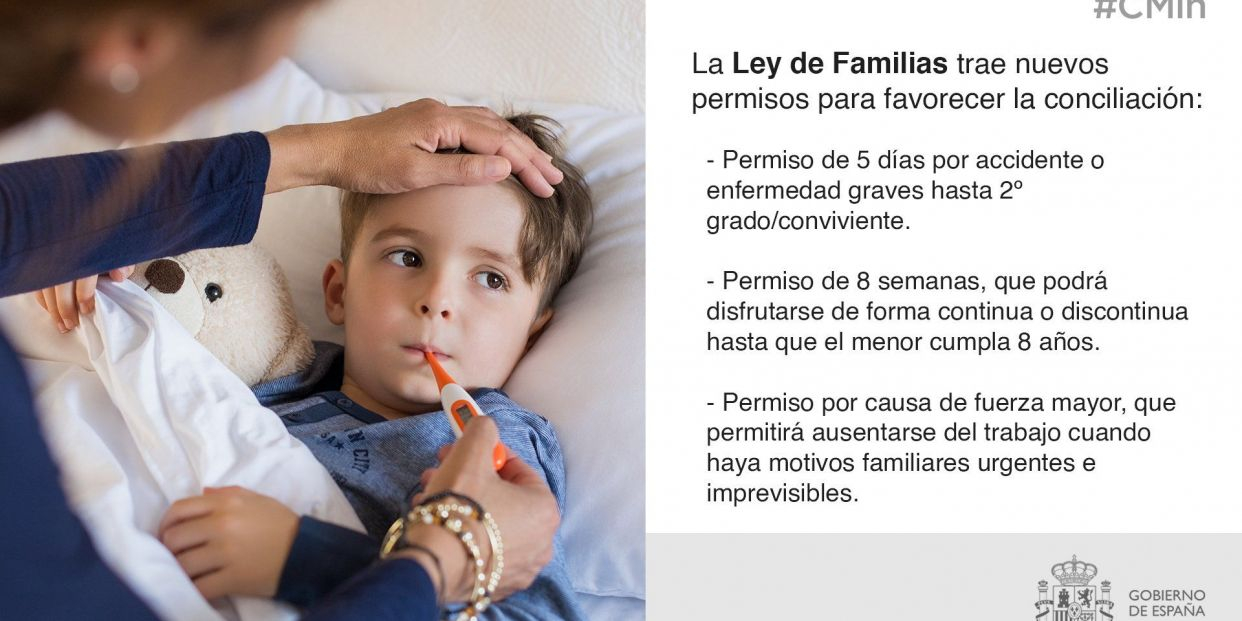 El Consejo de Ministros ha aprobado este martes la Ley de Familias, un proyecto legislativo propuesto por el Ministerio de Derechos Sociales y Agenda 2030, que equipara los derechos de las parejas de hecho a los de los matrimonios, incluye un permiso de cinco días retribuidos al año por accidente o enfermedad grave de familiares y convivientes, y otro de hasta cuatro días al año que se podrá disfrutar por horas, para atender situaciones de fuerza mayor ante urgencias e imprevistos familiares que requieran su presencia inmediata; extiende los beneficios de familias numerosas a monoparentales con dos hijos y prohíbe que los padres impidan el acceso a contenidos sobre diversidad familiar a través del conocido como 'PIN parental' en los centros educativos.