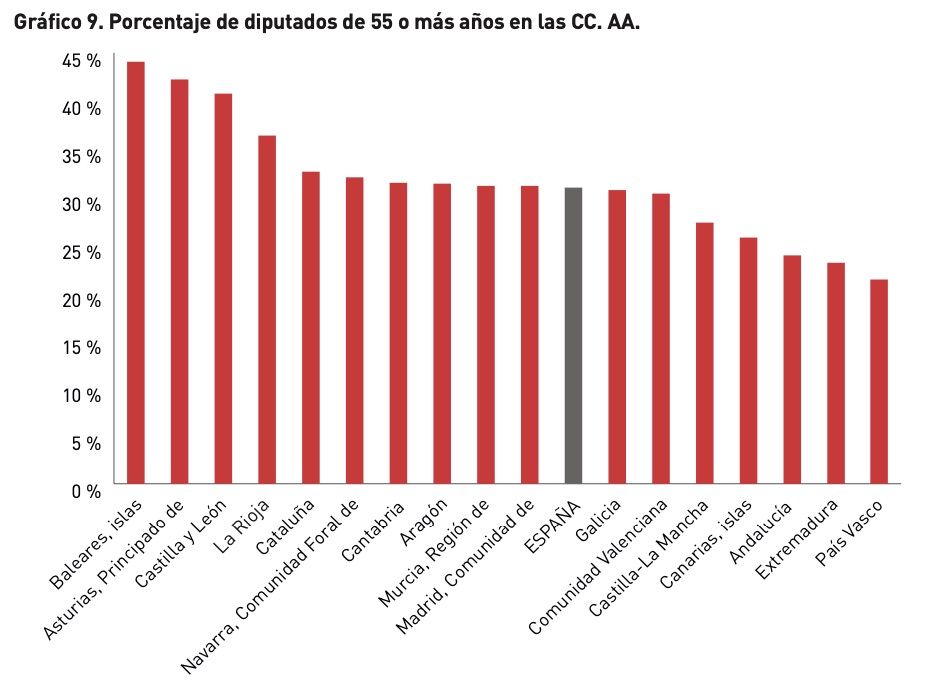El porcentaje de diputados con 55 años o más en las comunidades autónomas ha crecido ligeramente tras las últimas elecciones autonómicas, las de mayo de 2023. En concreto, ha subido medio porcentual respecto a la anterior edición del informe, al pasar del 30,37% al 30,93%. Se consolida la tendencia creciente en las tres ediciones de este informe.