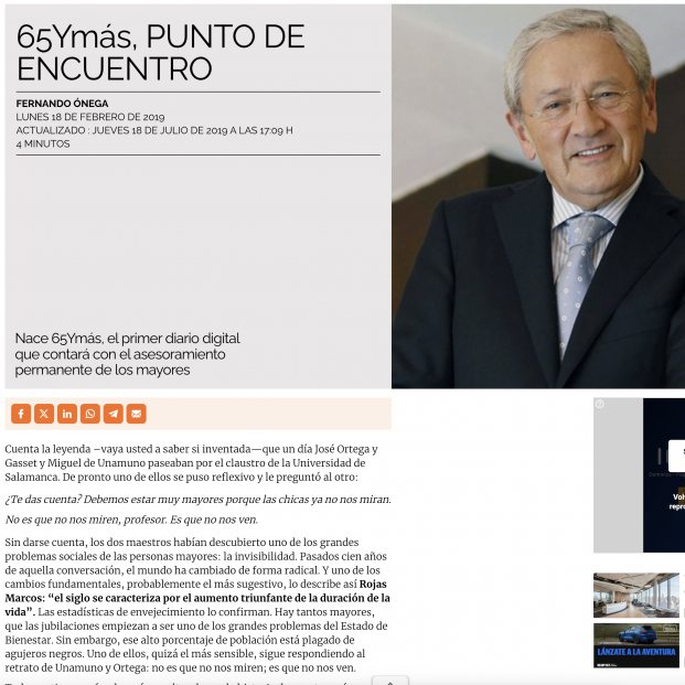 El 18 de febrero de 2019 nacía 65YMÁS y su presidente, Fernando Ónega, escribió y plasmó con su prodigiosa pluma el rumbo que iba a seguir este diario enfocado a los sénior. Lo tituló 'Punto de encuentro', porque precisamente ese era y es el objetivo de 65YMÁS: ser una comunidad, un punto de encuentro en el que los sénior expresen sus opiniones, demandas y aspiraciones.