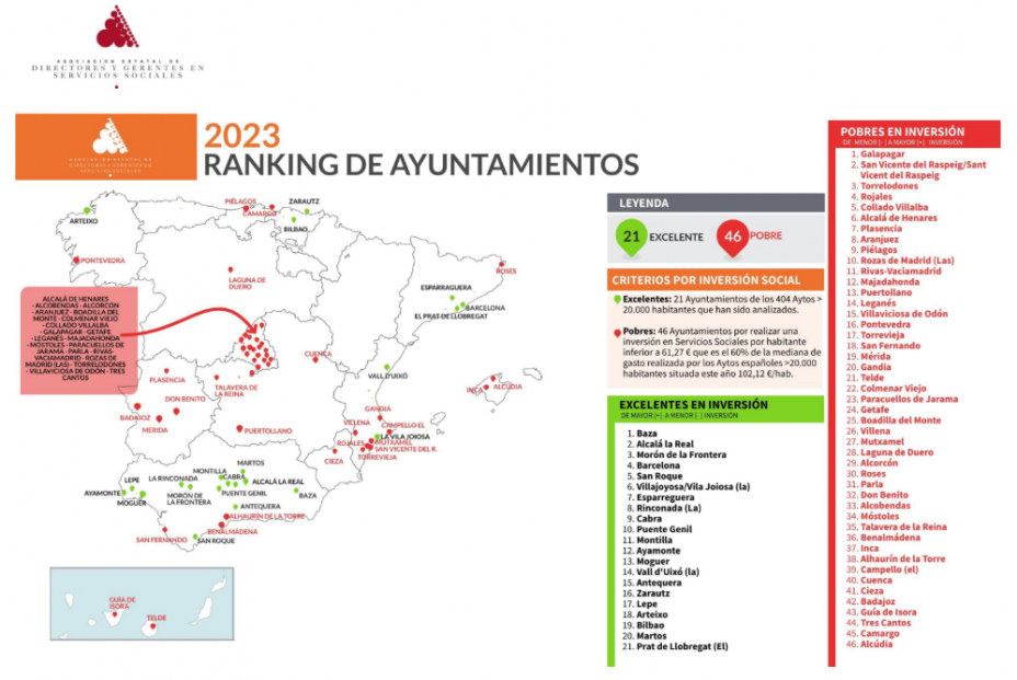 La Asociación Estatal de Directoras y Gerentes de Servicios Sociales ha constatado que "solo" el 5,2% de los 404 ayuntamientos españoles mayores de 20.000 habitantes alcanzan la "excelencia" por su inversión en Servicios Sociales, con más de 200 euros por habitante y año.