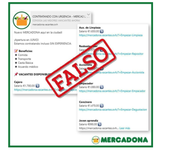 La cadena de mensajes que está circulando por la red social no especifica en qué ciudad se va a abrir ese supuesto nuevo establecimiento, “pero dice que hay vacantes de cajero o auxiliar de limpieza, entre otras. Sin embargo, desde Mercadona nos han asegurado que no son ofertas de empleo suyas”, concluyen desde esta web que se dedica a desmentir bulos, que añade que esta no es la primera vez que los ciberdelincuentes se hacen pasar por Mercadona para cometer un fraude.
